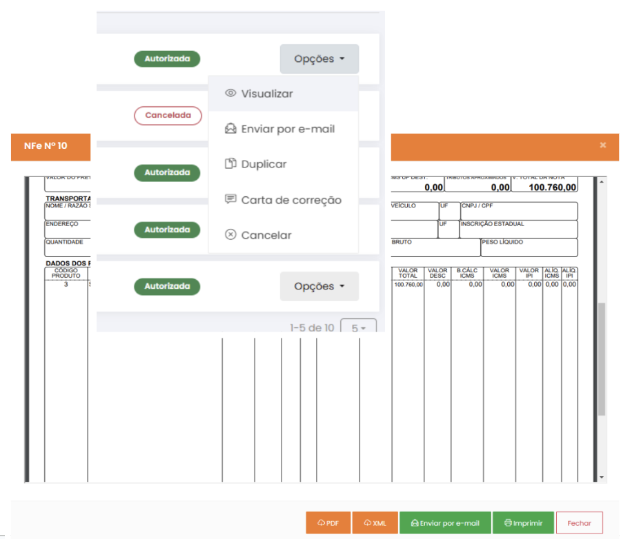 Imprima ou baixe (PDF / XML), duplique, envie por e-mail ou cancele suas notas